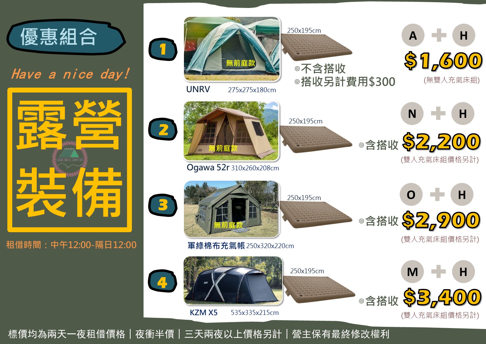 ⚫️標價均為兩天一夜租借價格